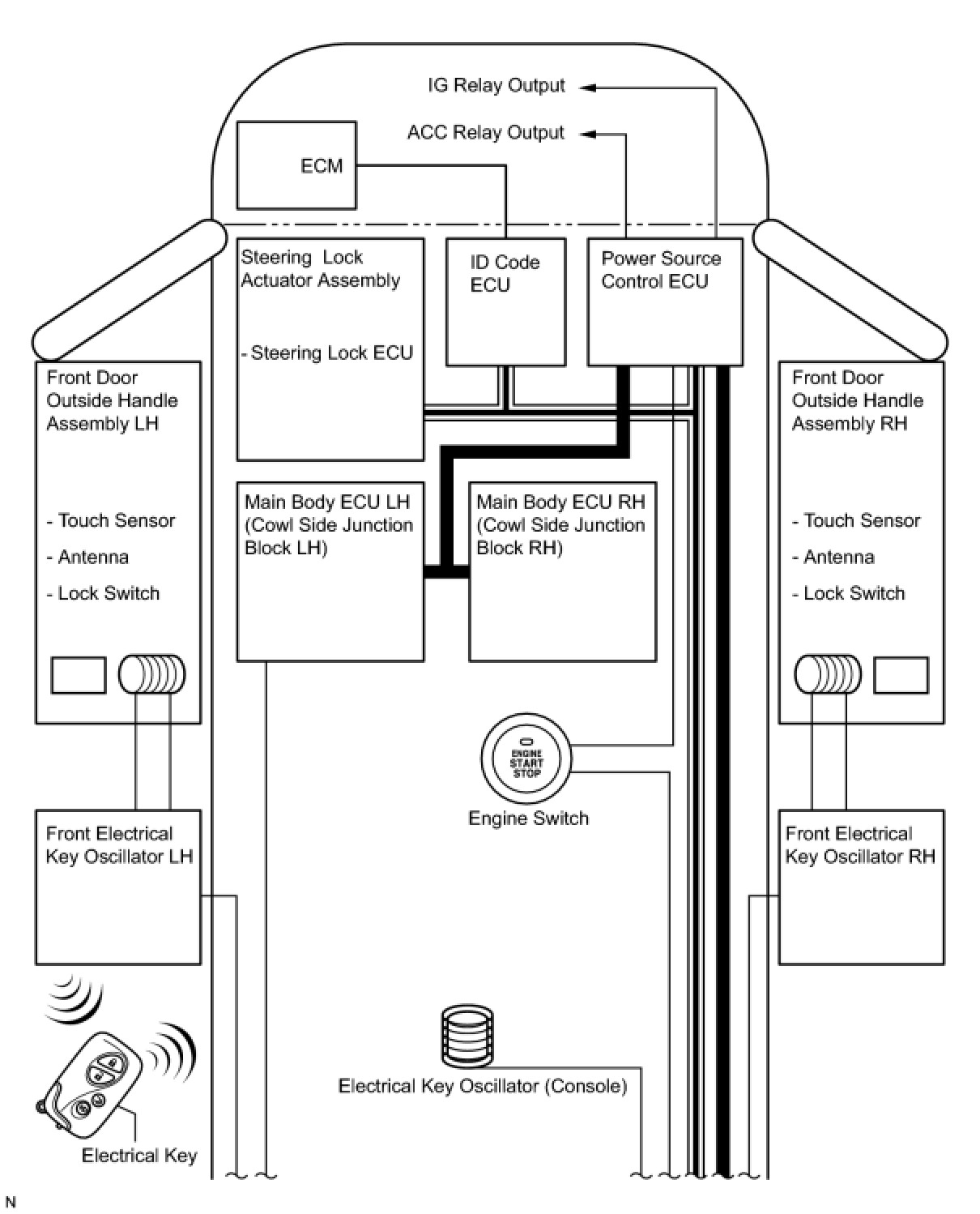 - The detection area of each door oscillator is formed by transmitting a request signal every 0.25 seconds while the engine switch is off and each door is locked. In this way, it detects the proximity of a electrical key. During entry lock, the detection area is formed with the lock switch ON.