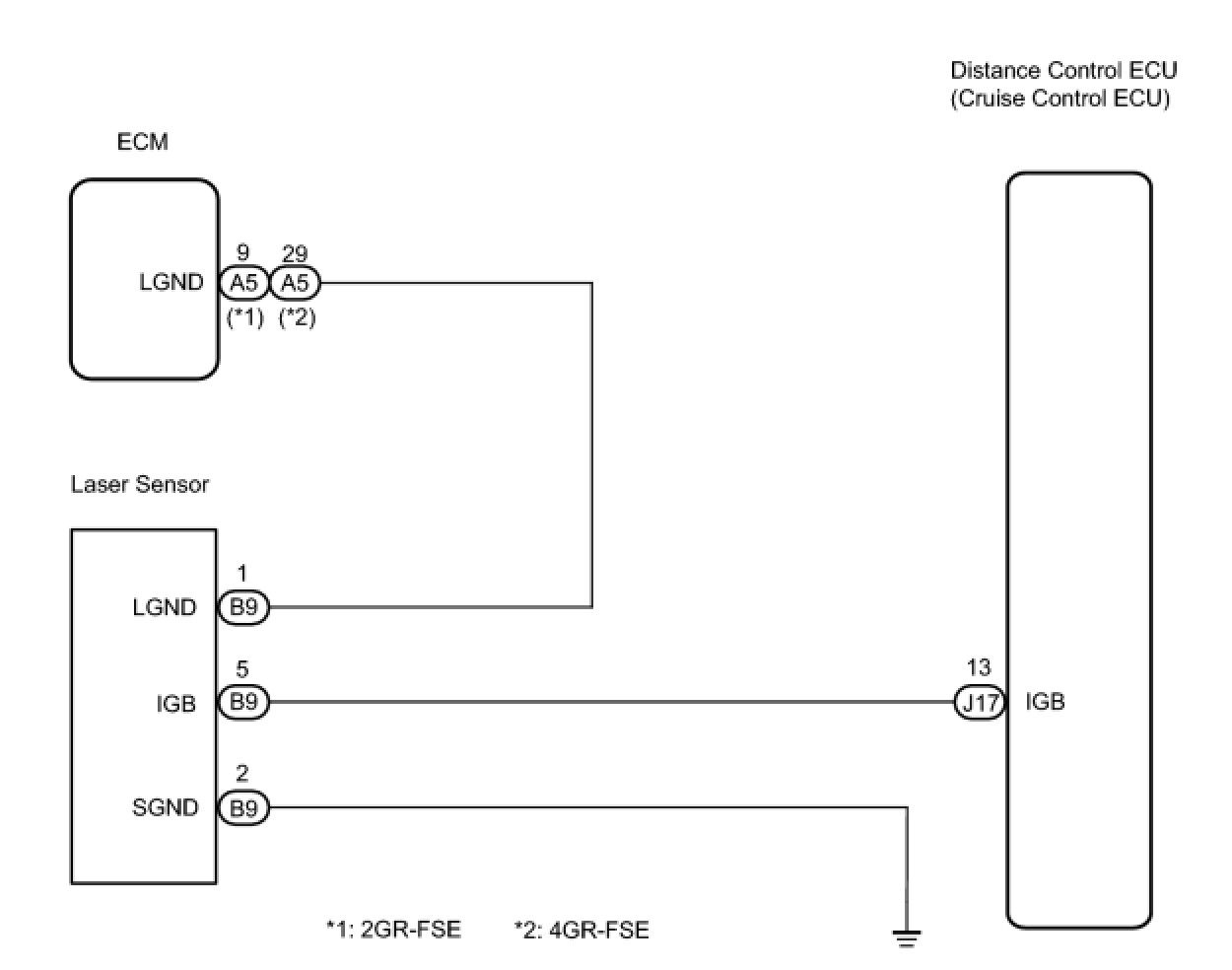 This circuit provides power to the millimeter wave radar sensor. The millimeter wave radar sensor emits radio waves towards an object in front and measures the distance and direction of the object by receiving the beam reflections. Based on the reflections, the sensor calculates the difference in speed between the vehicle and the object in front. This data is transmitted to the distance control ECU (cruise control ECU). The ECU recognizes the millimeter wave radar sensor via terminals LGND. If an open circuit occurs in the wire harness between terminals LGND, the ECM cannot recognize the millimeter wave radar sensor. The ECM will stop the control of the vehicle-to-vehicle distance control mode and only the constant speed control mode can be used.