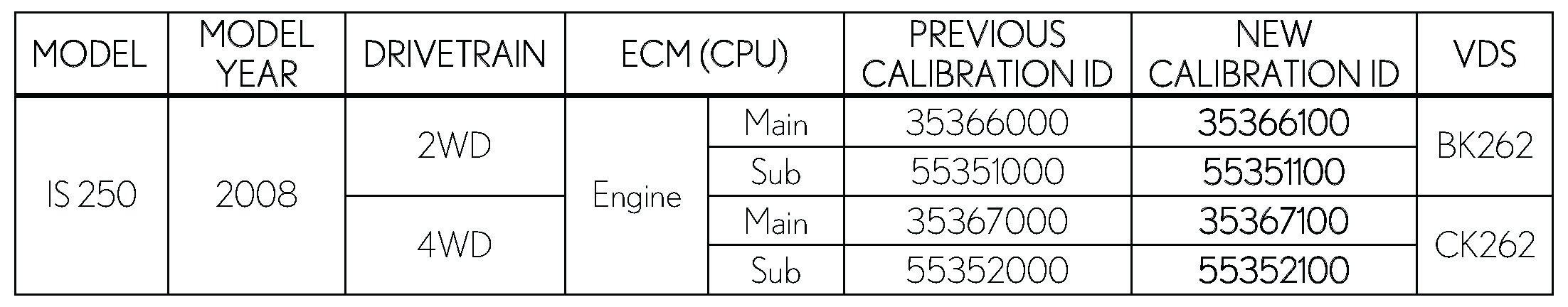 - Calibration ID(s) [Refer to the Calibration Identification Chart for the NEW CALIBRATION ID]