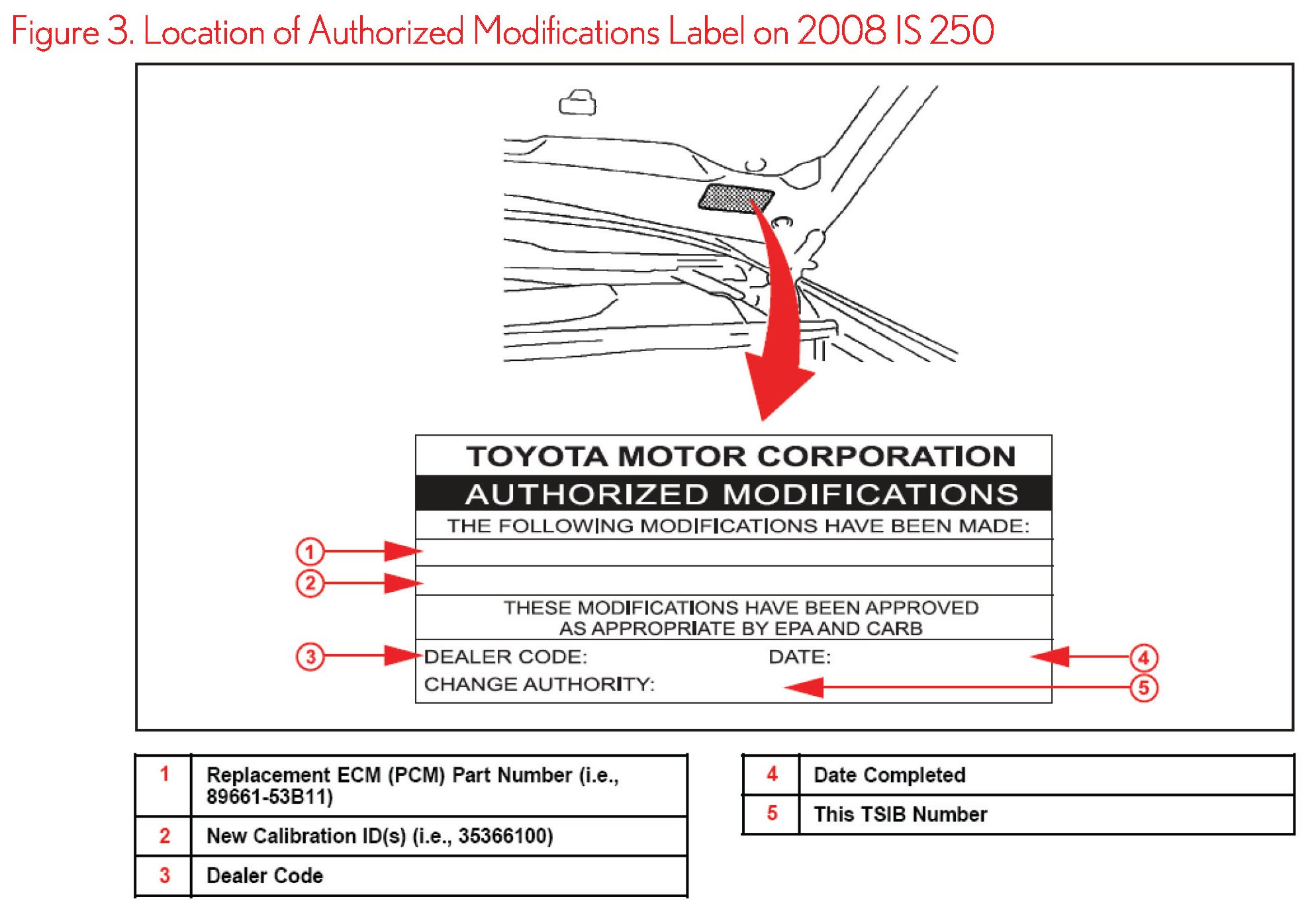 6. Check for the Authorized Modifications Label affixed to the vehicle in the location shown in Figure 3. Confirm if the ECM (PCM) calibration has been updated. If the calibration ID listed is NOT the latest ECM (PCM) calibration - go to step 7.