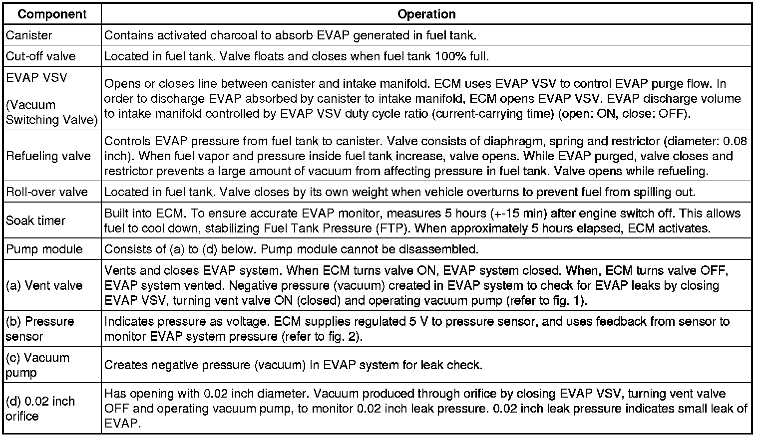 The electric vacuum pump creates negative pressure (vacuum) in the EVAP system and the pressure is measured. Finally, the ECM monitors for leaks from the EVAP system and malfunctions in both the pump module and EVAP VSV, based on the EVAP pressure.