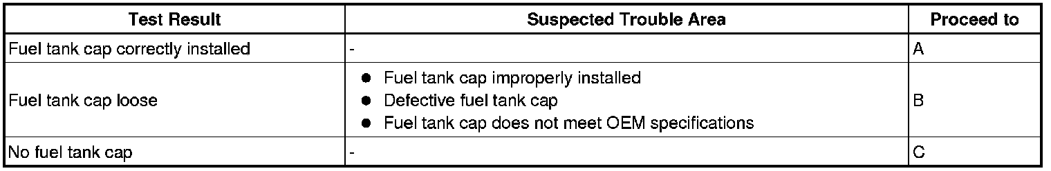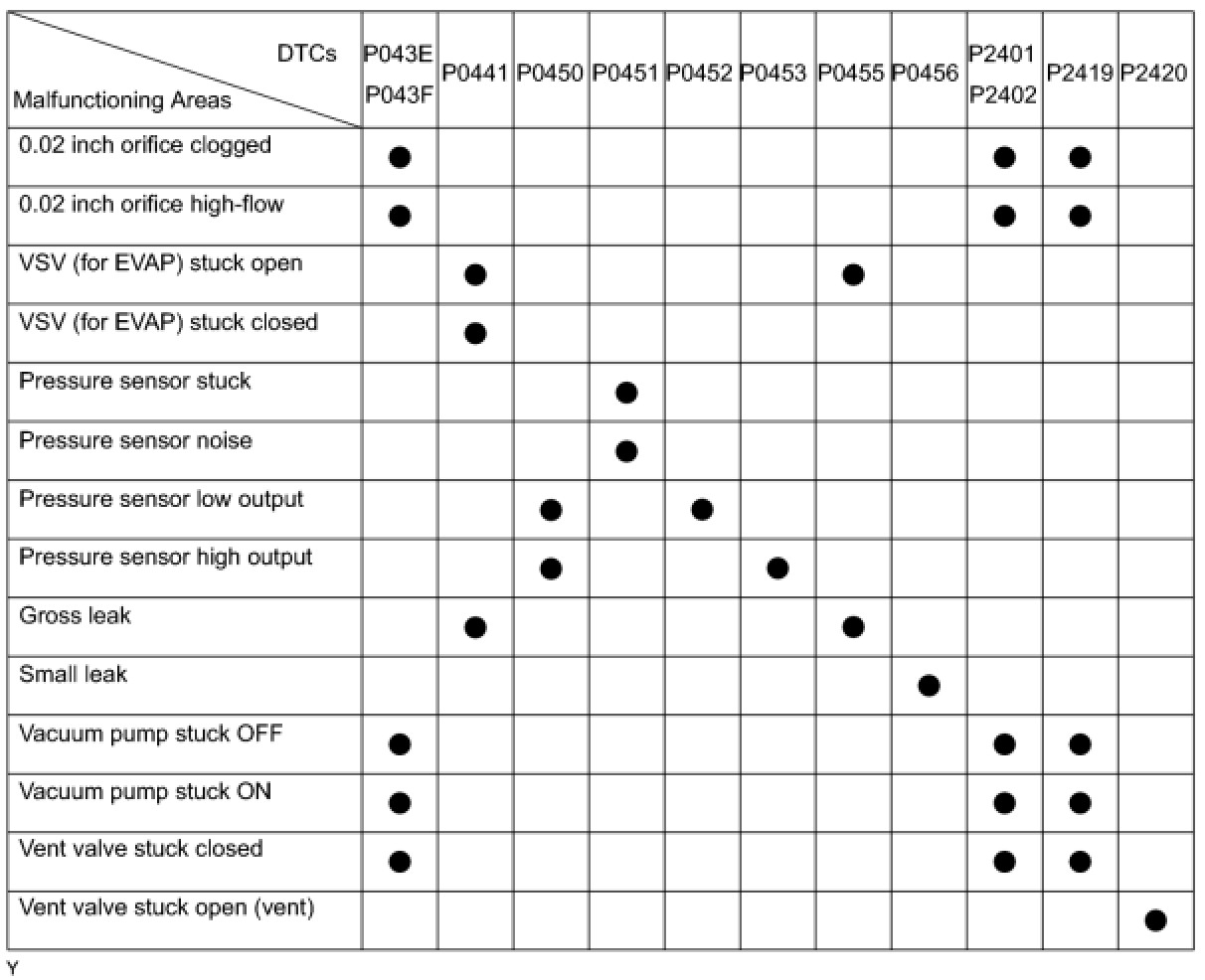 If any EVAP system DTCs are set, the malfunctioning area can be determined using the table below.