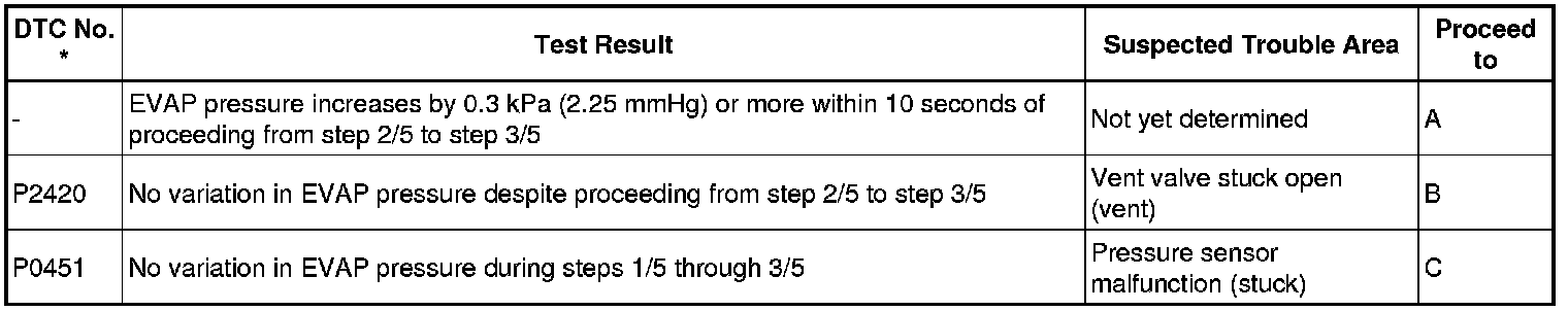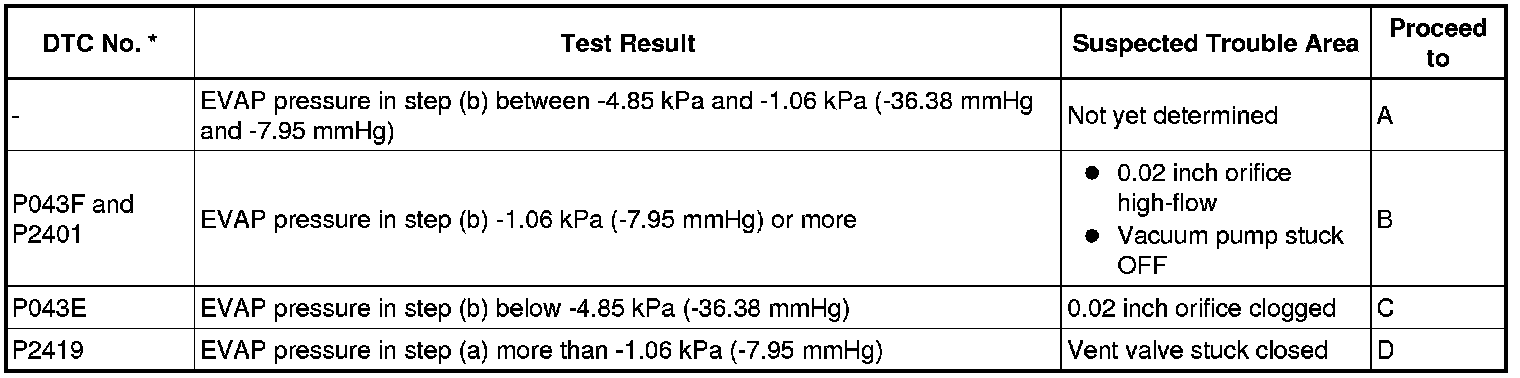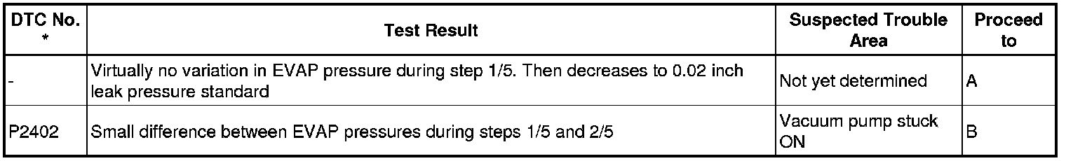 NOTE: If the 0.02 inch reference pressure difference between the first and second checks is greater than the specification, the DTCs corresponding to the reference pressure (P043E, P043F, P0441, P0455, P0456, P2401 and P2420) will all be stored.