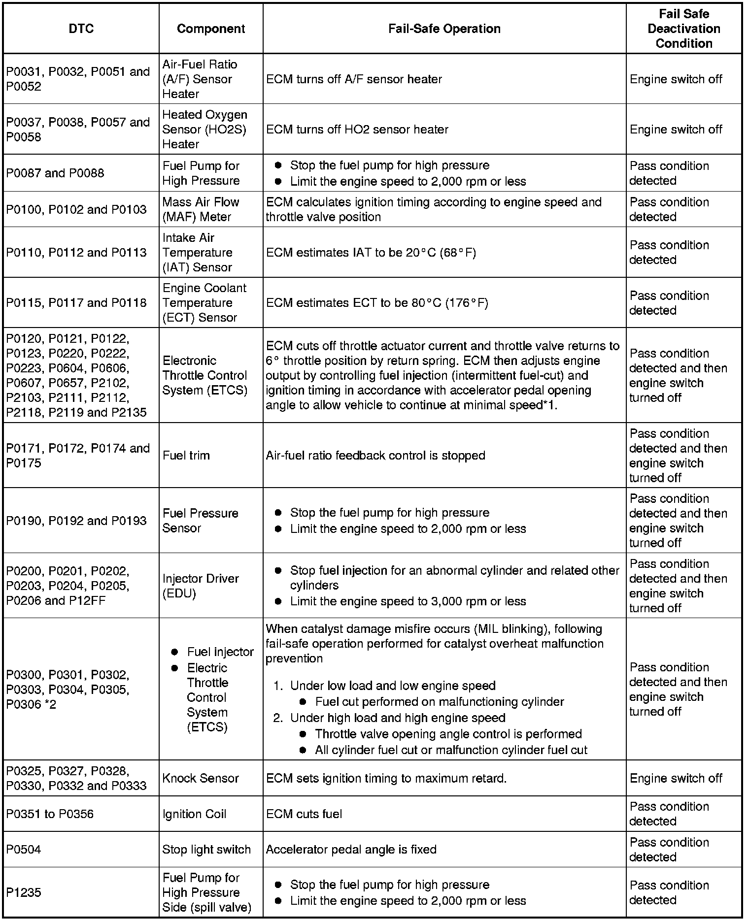 If any of the following DTCs are set, the ECM enters fail-safe mode to allow the vehicle to be driven temporarily.