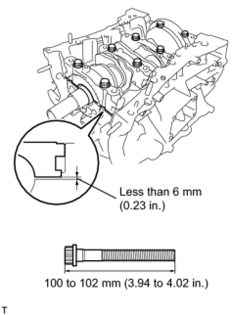 Insert the main bearing cap by hand until the clearance between the main bearing cap and the cylinder block is less than 6 mm (0.23 in.) by marking the 2 internal bearing cap bolts as a guide.