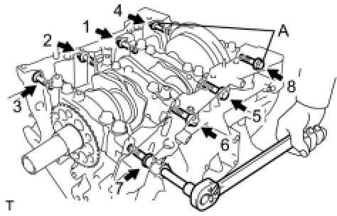Install 8 new seal washers and uniformly tighten the 8 main bearing cap bolts in several steps and in the sequence shown in the illustration.