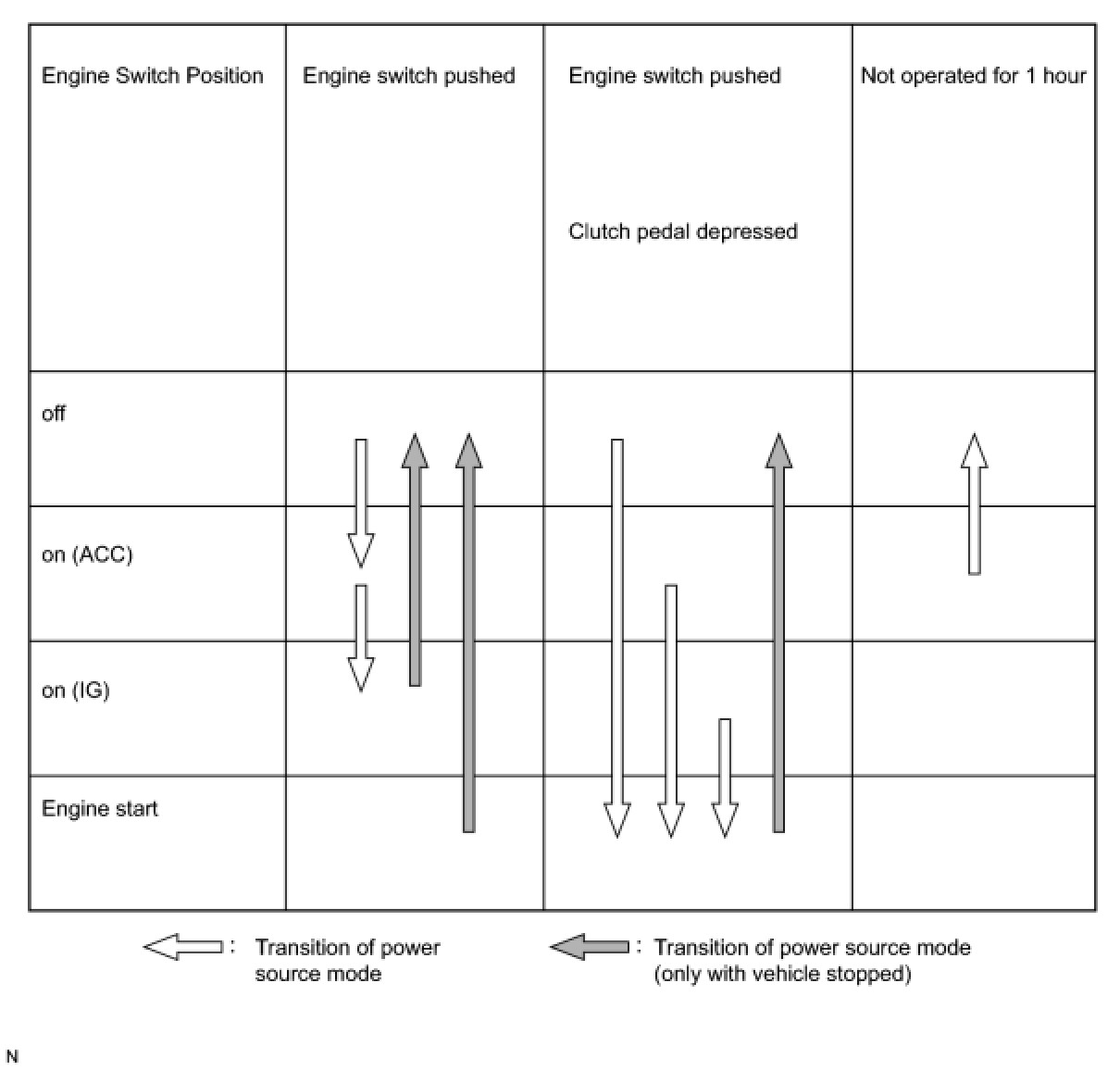 - After approximately 1 hour has passed with the engine switch on (ACC) and the power source control ECU will automatically cut the power supply (the power source mode changes to off).