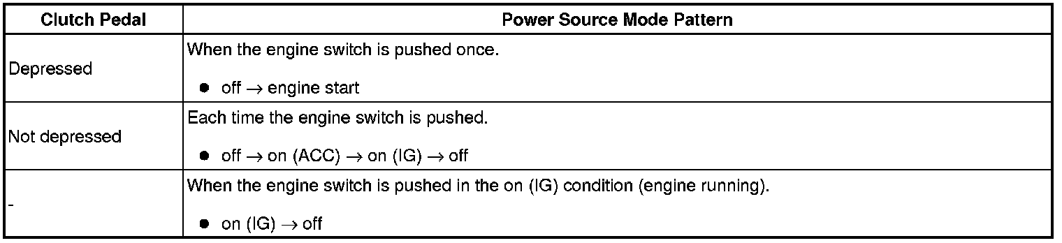 (h) After the buzzer sounds, if the engine switch is pressed within 5 seconds with the brake pedal not depressed (A/T) or clutch pedal not depressed (M/T), the power source mode changes to on (ACC) or on (IG), the same as in the normal condition.