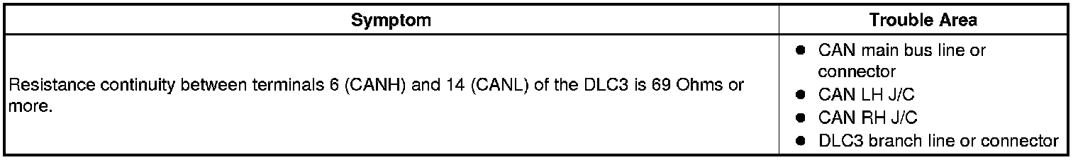 There may be an open circuit in the CAN main bus line and/or the DLC3 branch line when the resistance between terminals 6 (CANH) and 14 (CANL) of the DLC3 is 69 Ohms or more.