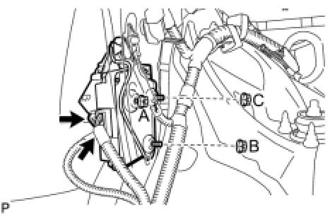 (d) Insert the 2 bolts into the holes on the vehicle body and fully tighten the 3 nuts in the order of B, A, and C.