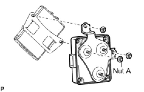 (c) Insert loosely tightened nut A into the hole on the vehicle body (left side of the luggage compartment). Slide down the seat belt control ECU and the clearance warning ECU as a unit to temporarily install them.
