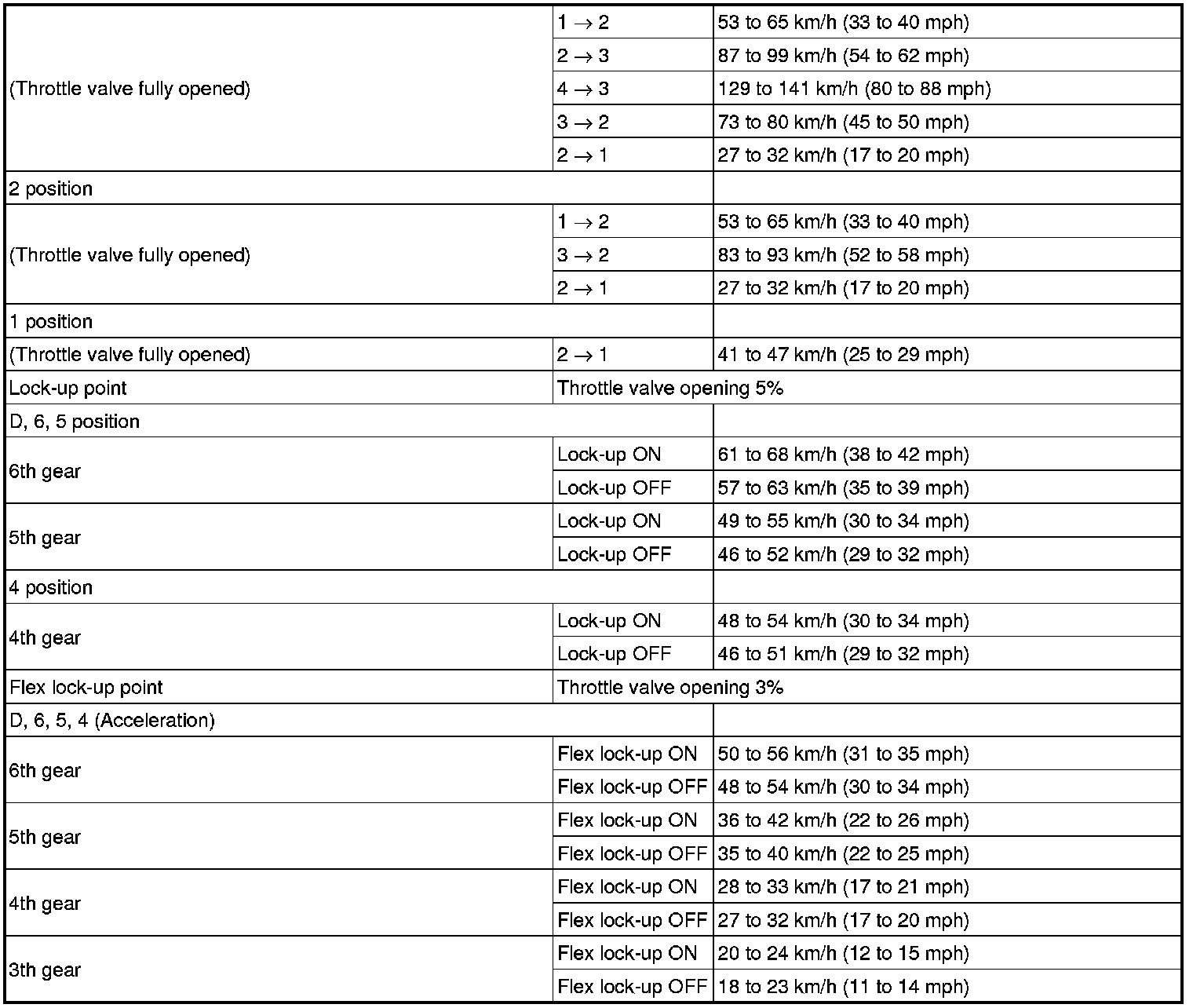 - All shift point values indicated in the above tables are actual values. Therefore, if checking a shift point with a chassis dynamometer, keep in mind that there is a range of error in the chassis dynamometer indication.