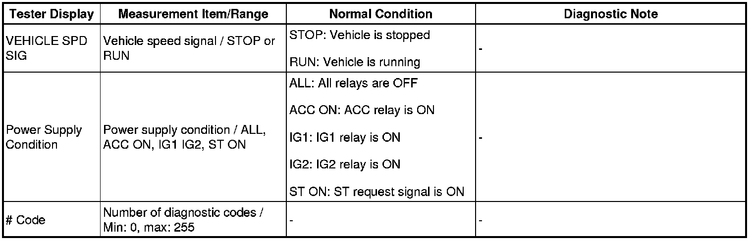 HINT: Using Techstream to read the Data List allows the values or states of switches, sensors, actuators and other items to be read without removing any parts. This non-intrusive inspection can be very useful as intermittent conditions or signals may be discovered before parts or wiring is disturbed. Reading the DATA LIST information early in troubleshooting is one way to save diagnostic time.