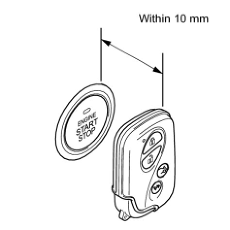 - When the electrical key transmitter cannot be verified even though it is within 10 mm (0.394 in.) from the switch, the engine start check can be performed by removing the transmitter battery from the electrical key transmitter and holding the transmitter against the engine switch.