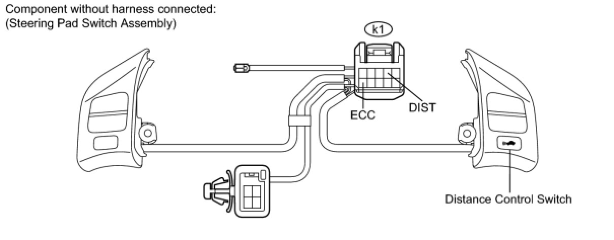 The distance control switch sets the vehicle-to-vehicle distance control mode. The distance control switch is installed in the steering pad switch. The vehicle-to-vehicle distance set value can be changed by operating the steering pad switch (distance control switch) while the dynamic radar cruise control system is in operation. The steering pad switch uses the BEAN to communicate with each ECU. Therefore, it does not have a direct connection with the ECM. If there are any malfunctions in the communication line of the steering pad switch, one or more DTCs in the multiplex communication system are output.