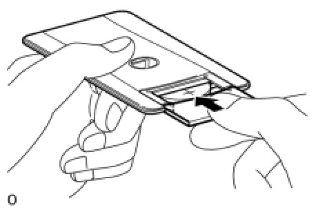 (c) Push in and install the transmitter battery (lithium battery (CR2412)) while being careful of the following: 1) the battery's positive (+) and negative (-) terminals; and 2) being sure to insert the battery between the 2 terminals and deep into the card, in the direction of the arrow.
