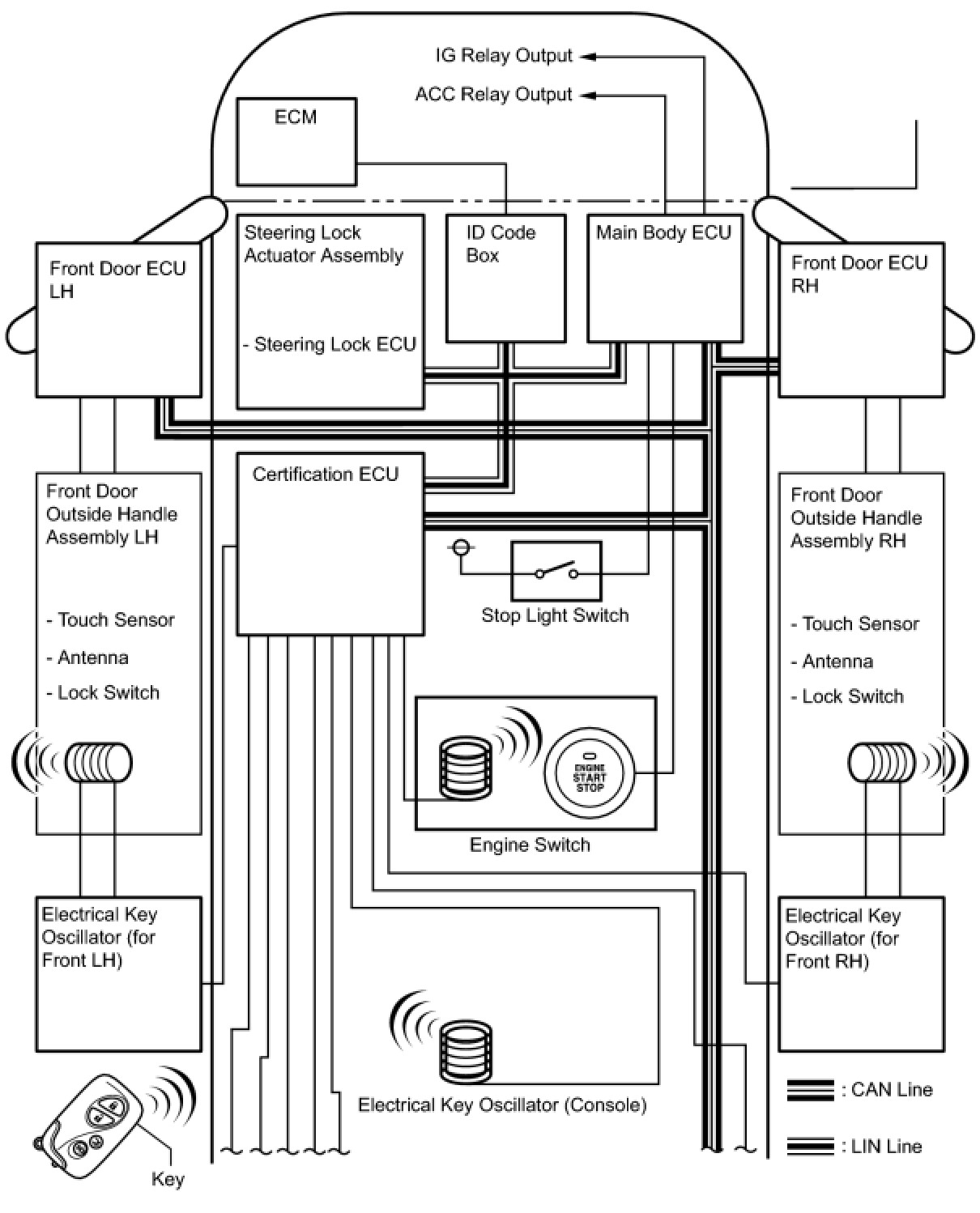 - This system is controlled by the certification ECU. When the certification ECU detects the presence of the key in one of the detection areas, it identifies and checks the ID code, and outputs operation signals to the related ECU in accordance with their functions.