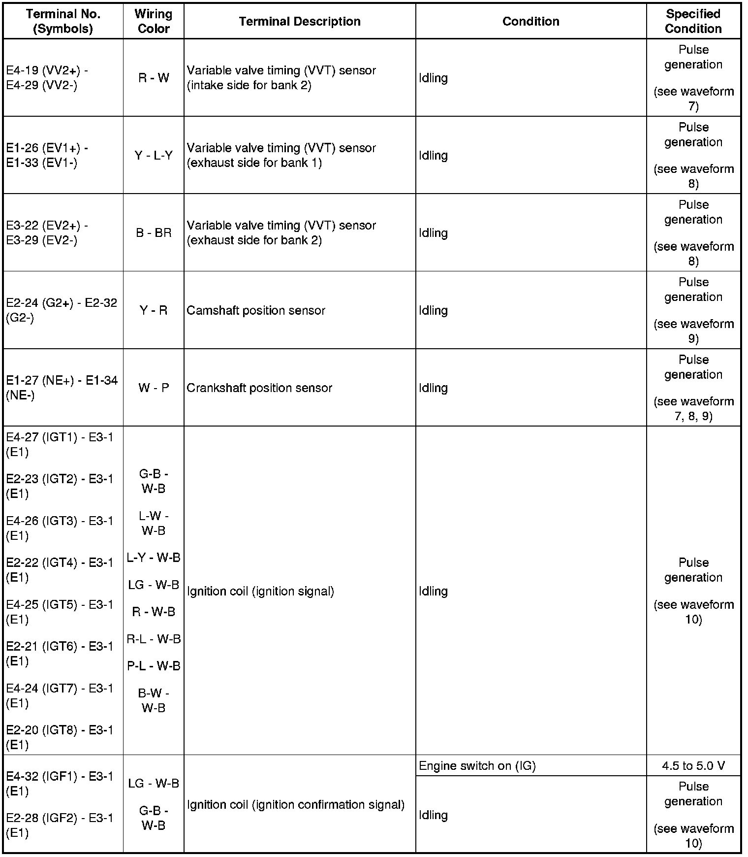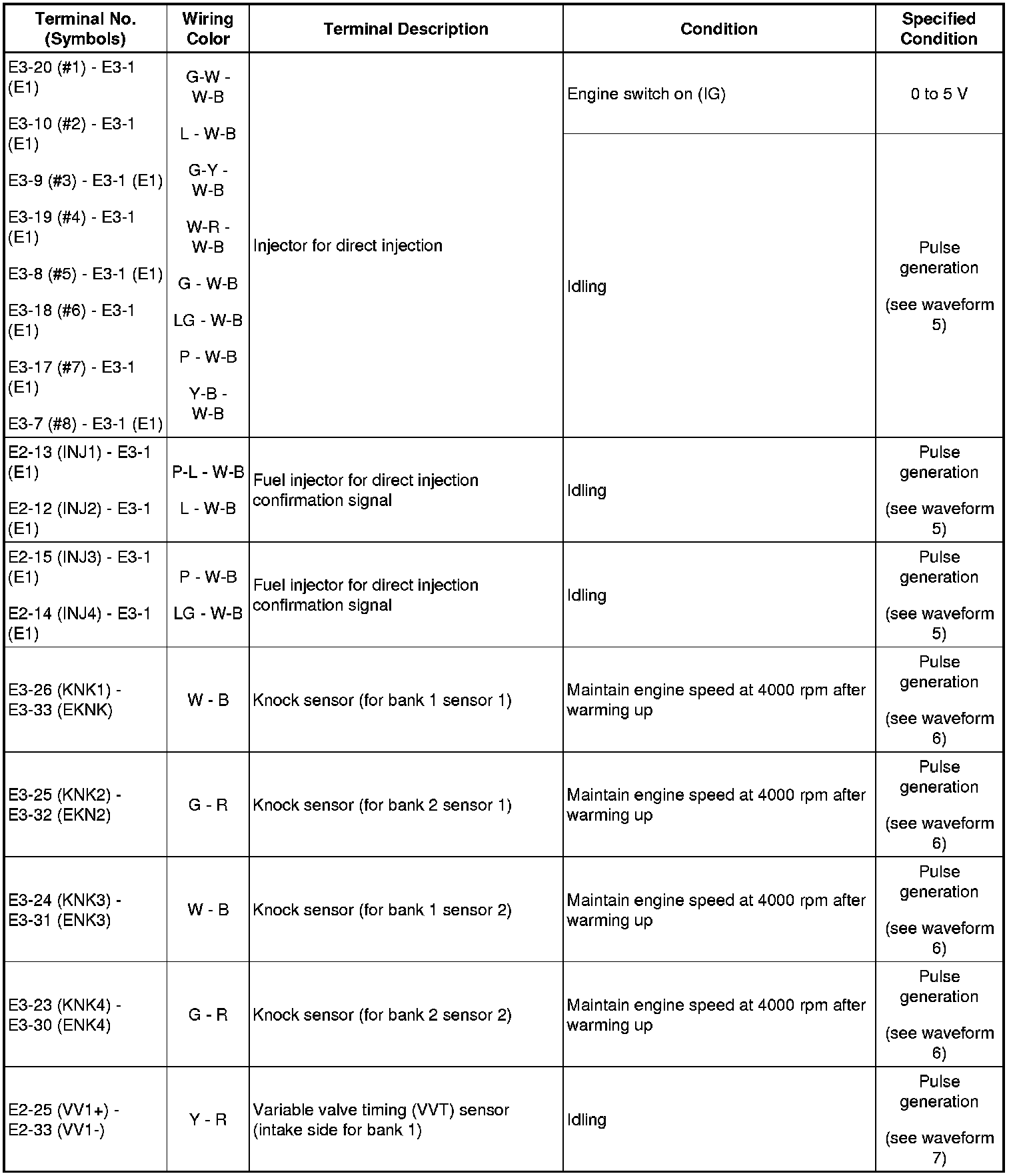 HINT: The standard normal voltage between each pair of the ECM terminals is shown in the table below. The appropriate conditions for checking each pair of the terminals are also indicated. The result of checks should be compared with the standard normal voltage for that pair of terminals, displayed in the Specified Condition column. The illustration above can be used as a reference to identify the ECM terminal locations.