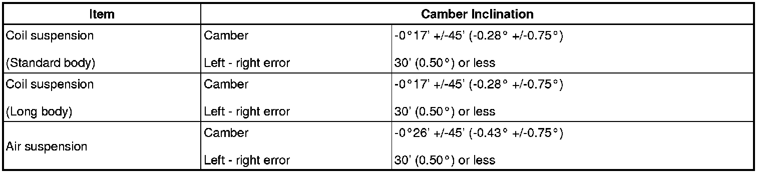 - The maximum tolerance of right and left difference for the camber is 30' or less.
