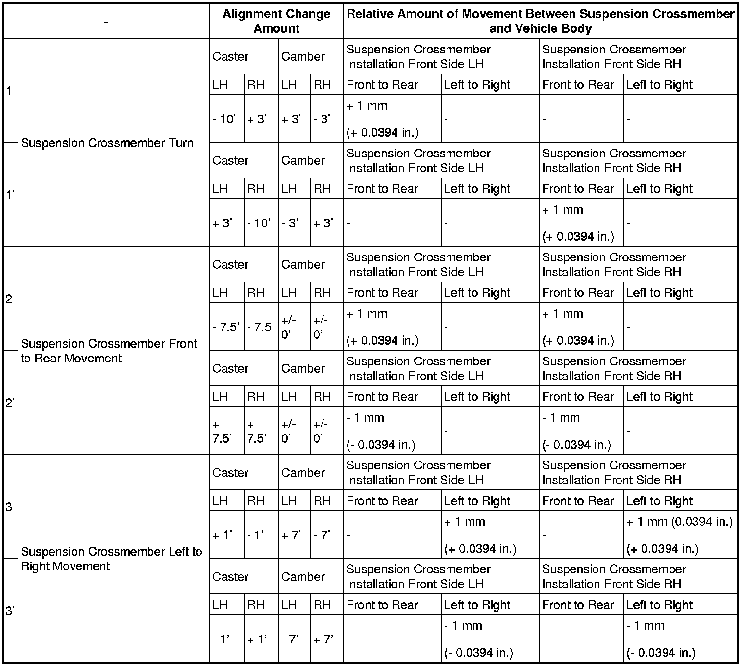 Relative alignment change based on amount of suspension crossmember movement in each direction: