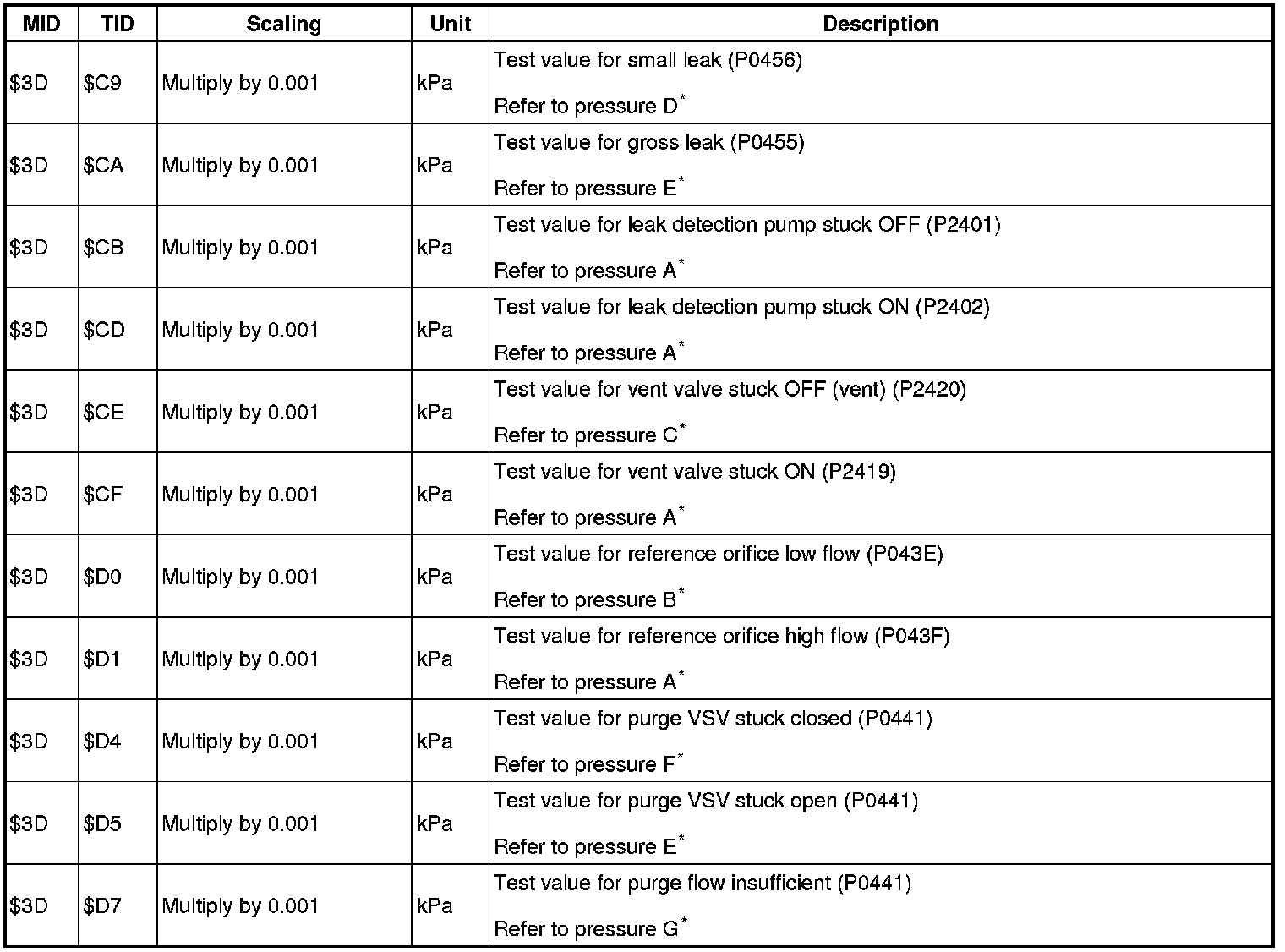 The test value and test limit information are described in the following table. This information is included under Monitor Result in the emissions-related DTC sections: