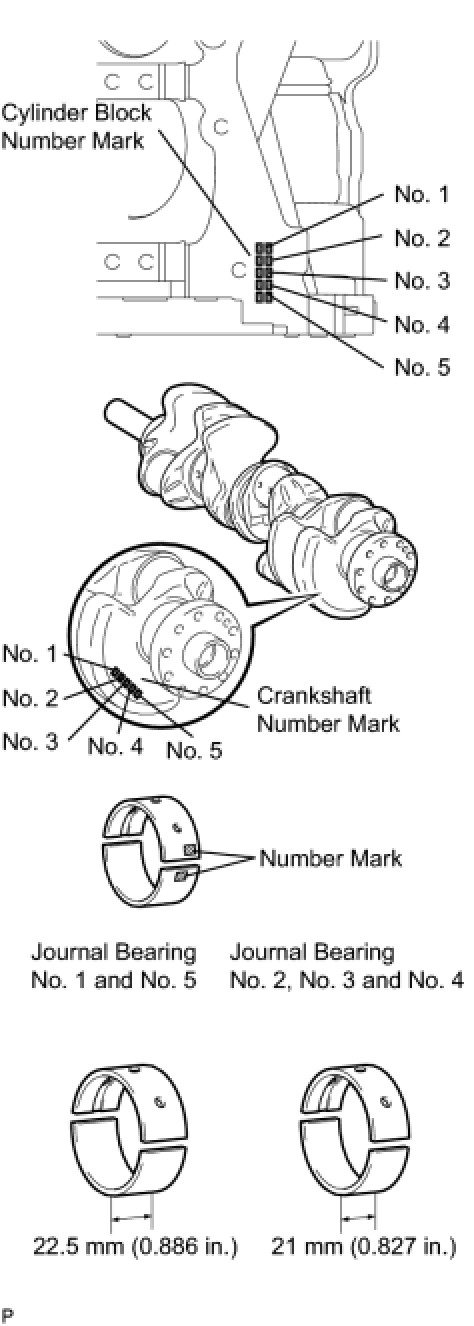 HINT: If replacing a bearing, replace it with one having the same number. If the number of the bearing cannot be determined, select the correct bearing by adding together the numbers imprinted on the cylinder block and crankshaft. Refer to the table for the appropriate bearing number. There are 6 sizes of standard bearings. For No. 1 and No. 5 position bearings, use bearings marked 4, 5, 6, 7, 8 and 9. For other position bearings, use bearing marked 3, 4, 5, 6, 7 and 8.