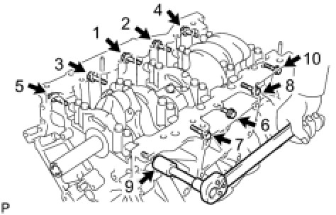 Final pass: Install and uniformly tighten 10 bolts and 10 seal washers in several steps in sequence 45 Nm (459 kgf-cm, 33 ft-lbf)