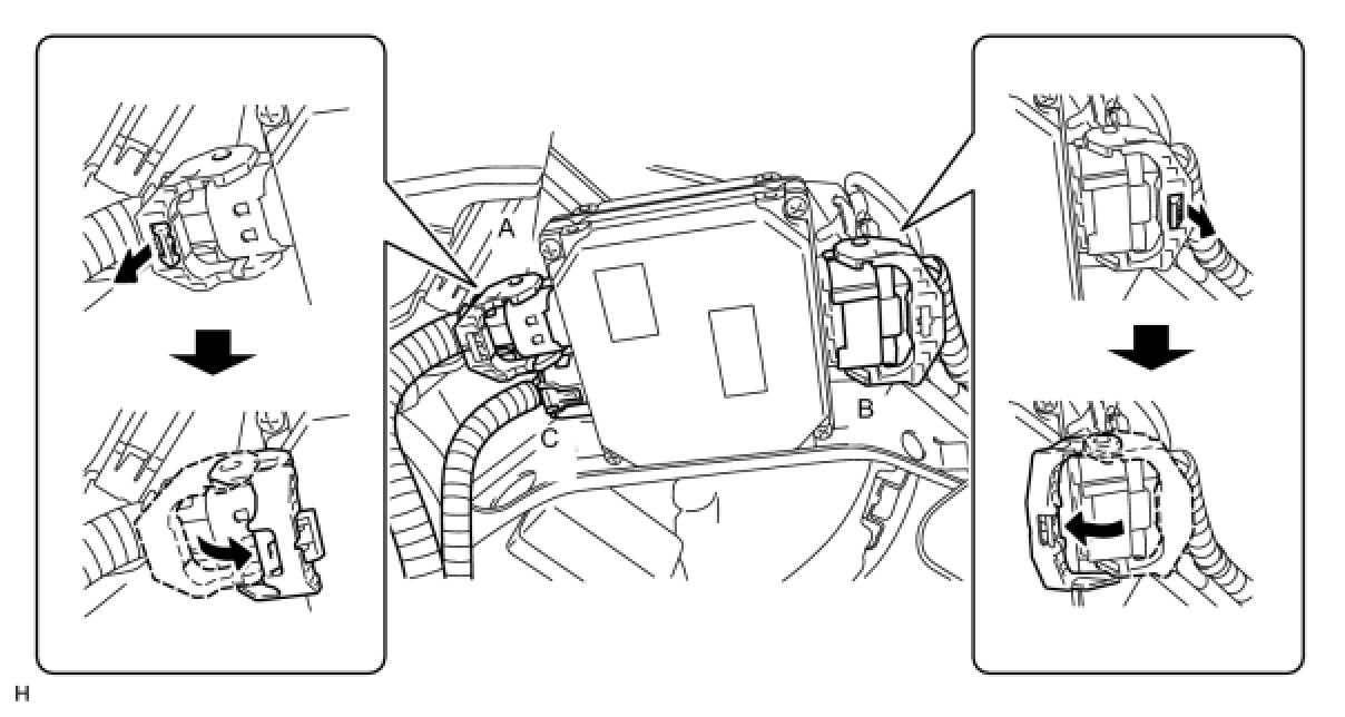 (a) Release the locks of the 2 power steering ECU connectors A and B and disconnect the connectors.
