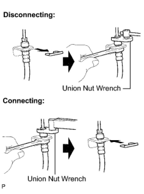 2 Hold the flexible hose with a wrench. Using union nut wrench, disconnect the brake tube without deforming the tube.