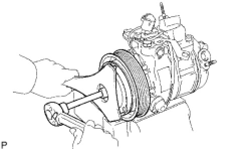 (e) Using a snap ring expander, remove the snap ring and magnetic clutch rotor.