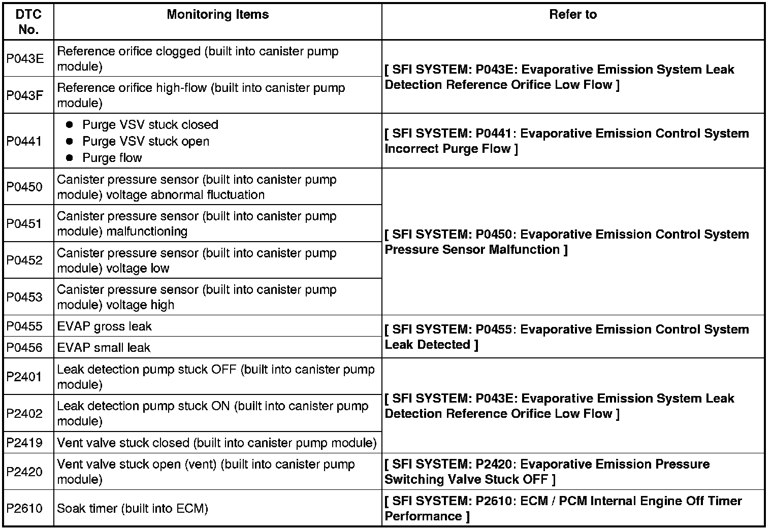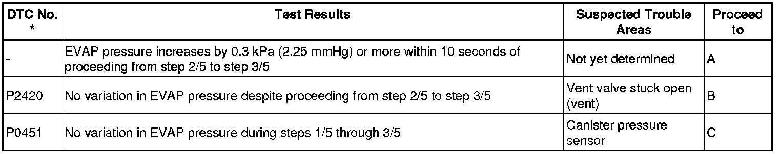 If any EVAP system DTCs are set, the malfunctioning area can be determined using the table below.
