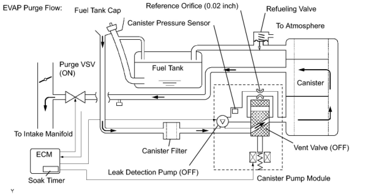 While the engine is running, if a predetermined condition (closed loop, etc.) is met, the purge VSV is opened by the ECM and stored fuel vapors in the canister are purged to the intake manifold. The ECM changes the duty cycle ratio of the purge VSV to control purge flow volume.