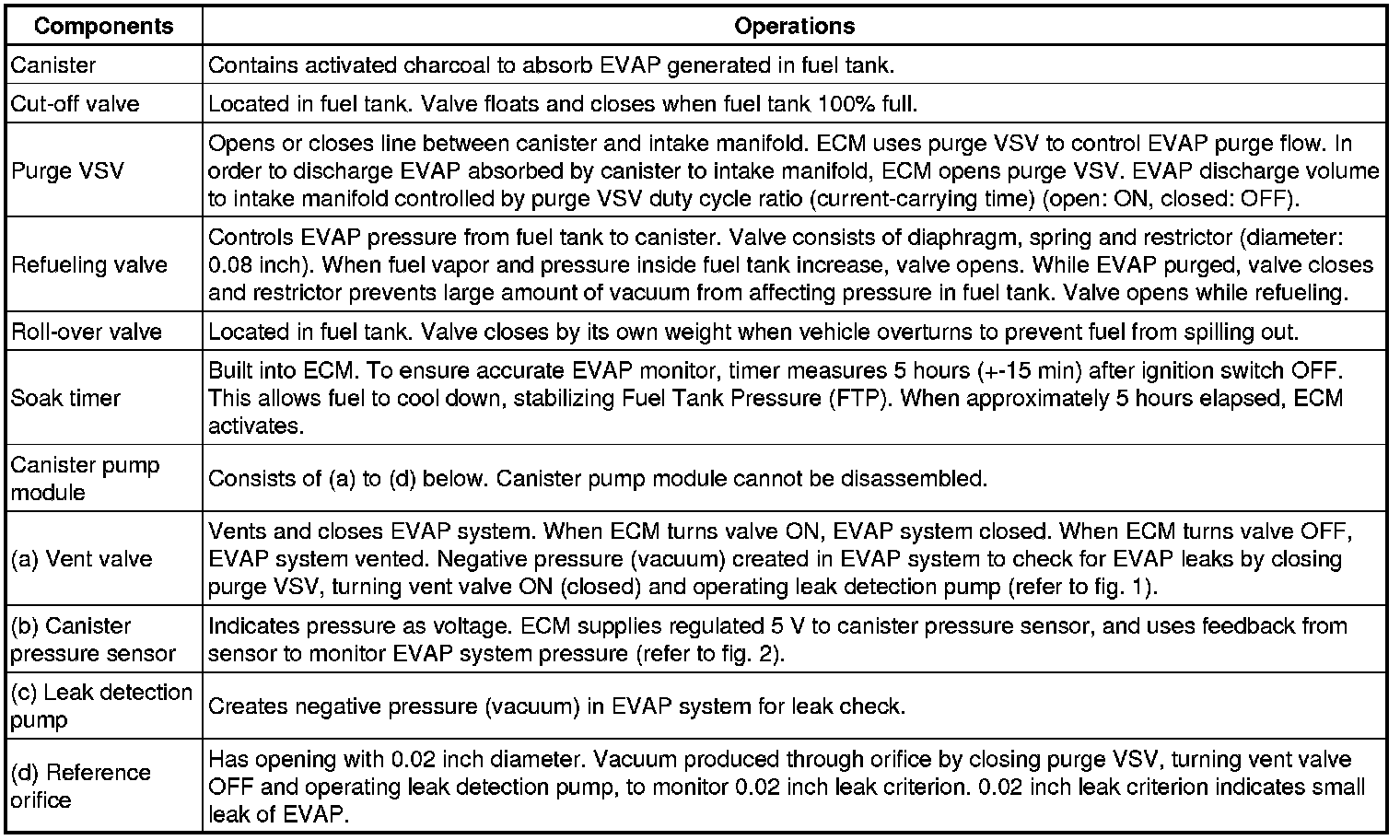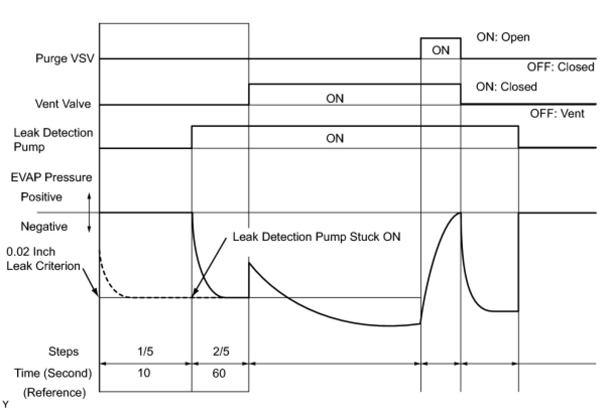 The leak detection pump creates negative pressure (vacuum) in the EVAP system and the pressure is measured. Finally, the ECM monitors for leaks from the EVAP system and malfunctions in both the canister pump module and purge VSV based on the EVAP pressure.
