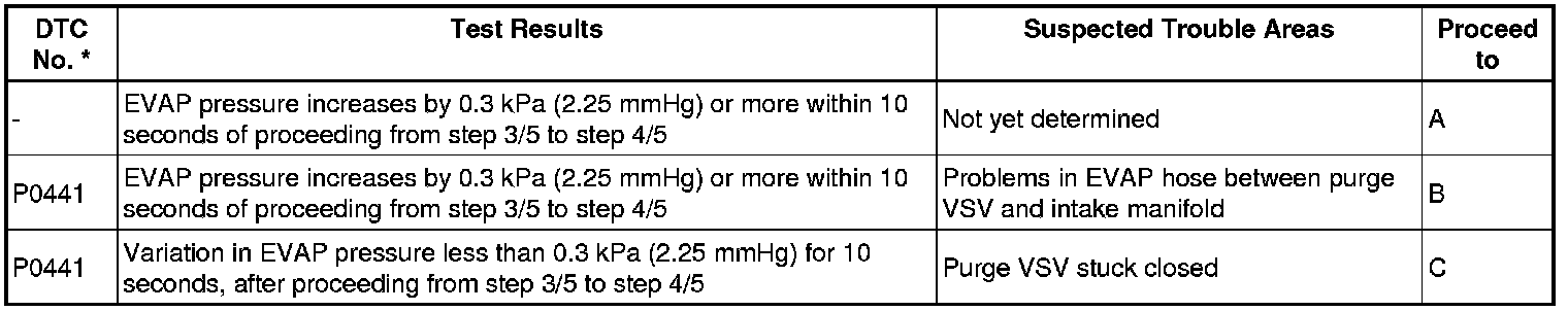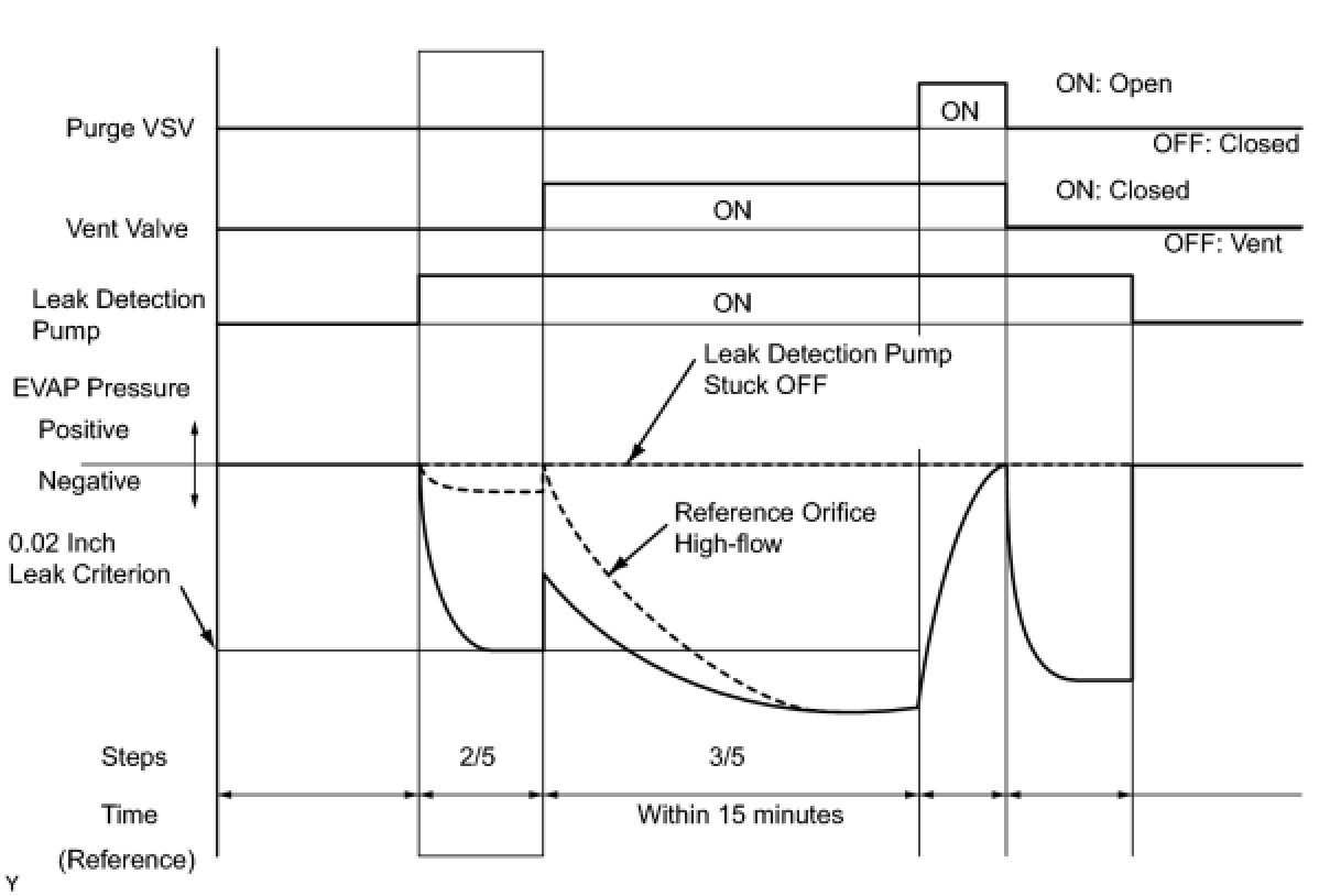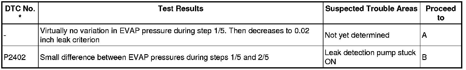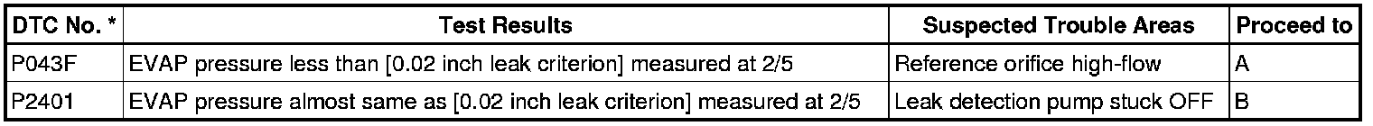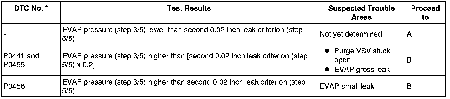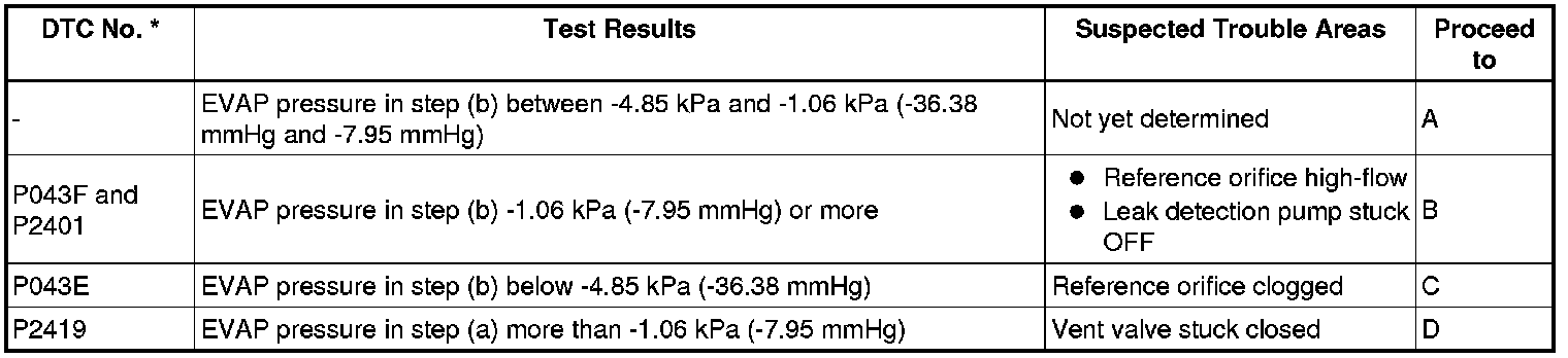 NOTE: If the 0.02 inch reference pressure difference between the first and second checks is greater than the specification, the DTCs corresponding to the reference pressure (P043E, P043F, P0441, P0455, P0456, P2401 and P2420) will all be stored.
