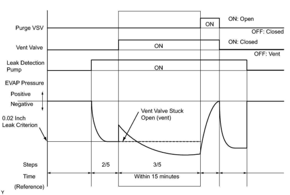 The vent valve is turned OFF (open) and the EVAP pressure is measured. If negative pressure is not created, the ECM interprets this as the purge VSV being stuck closed, illuminates the MIL and sets DTC P0441 (2 trip detection logic).