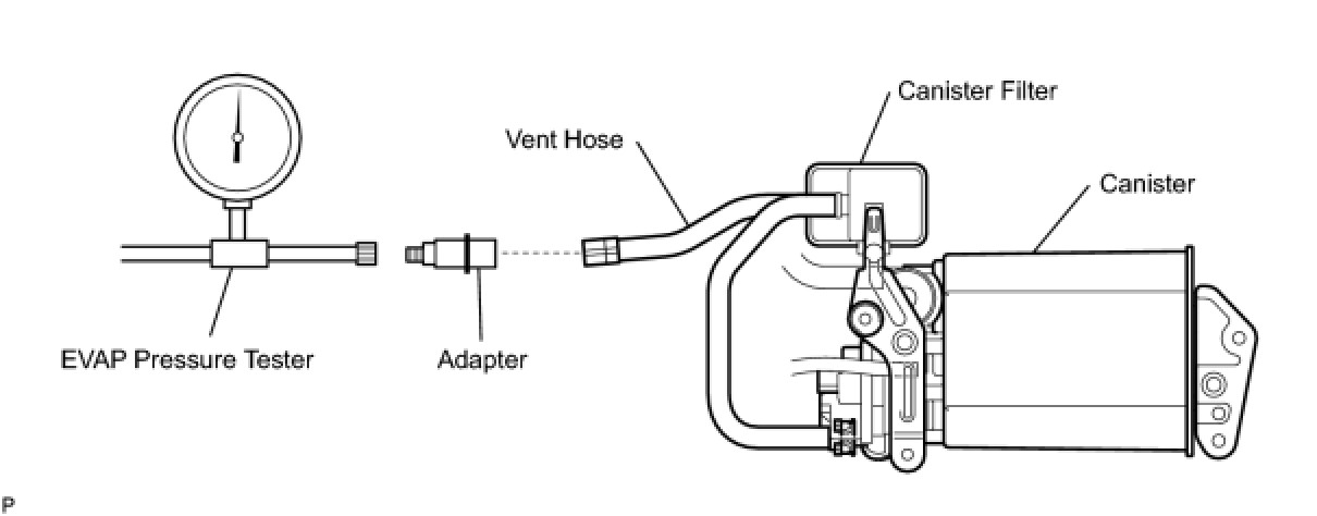 NOTE: In this vehicle's EVAP system, turning ON the vent valve does not seal off the EVAP system. To check for leaks in the EVAP system, disconnect the air inlet vent hose and apply pressure from the atmosphere side of the canister.