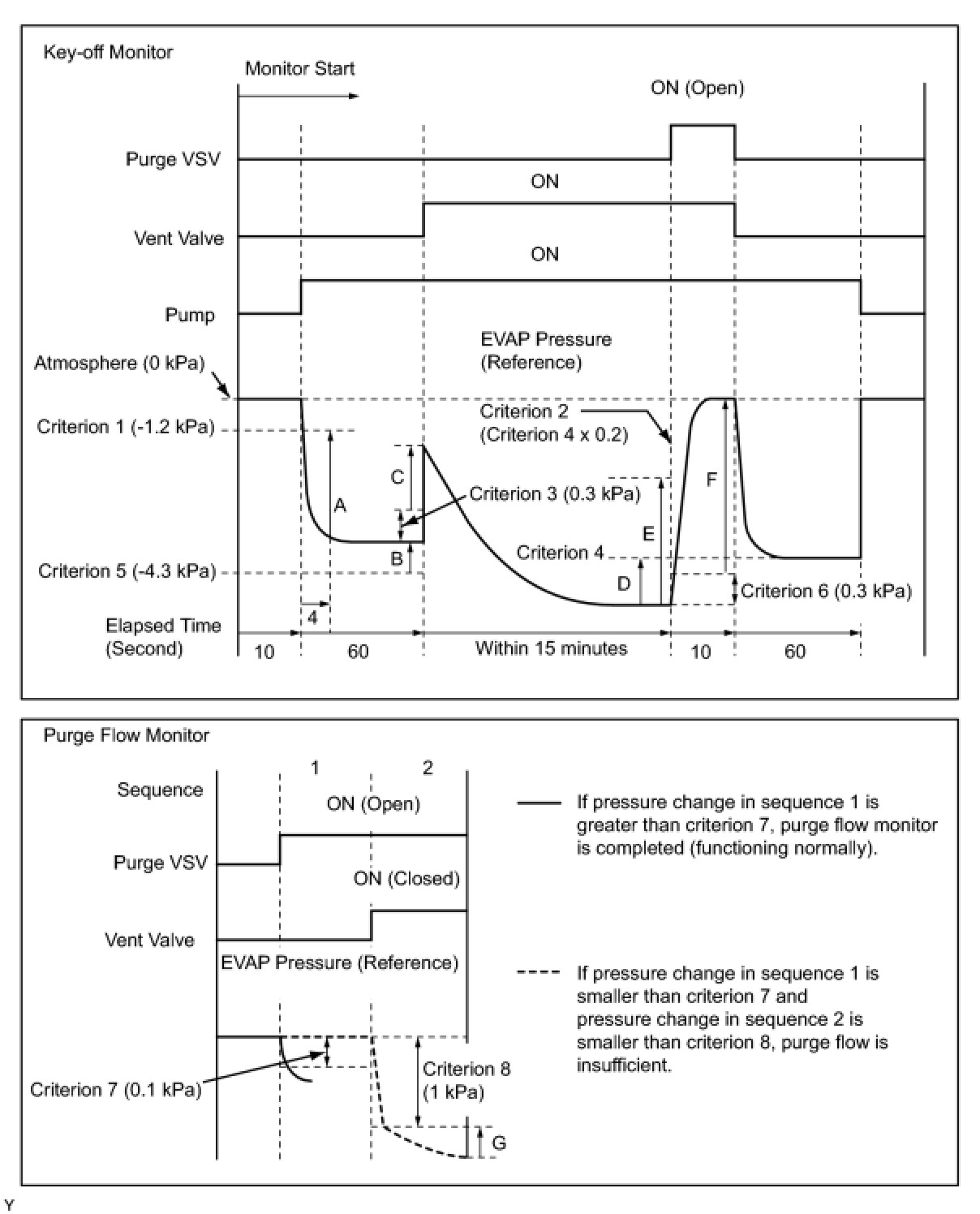 While the engine is running and the purge Vacuum Switching Valve (VSV) is ON (open), the ECM monitors the purge flow by measuring the EVAP pressure change. If negative pressure is not created, the ECM begins the 2nd monitor.
