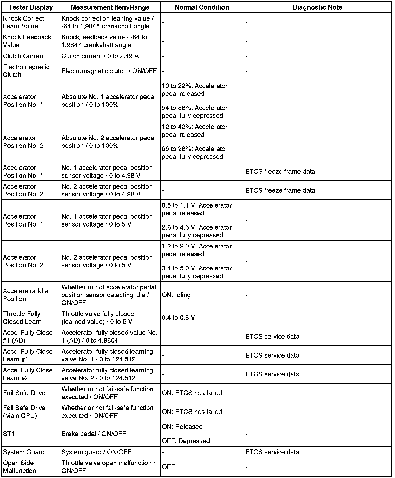 NOTE: In the table below, the values listed under Normal Condition are for reference only. Do not depend solely on these values when determining whether or not a part is faulty.