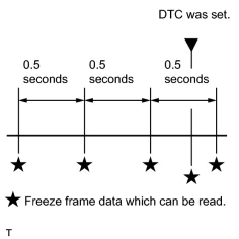 - The ECM records engine conditions in the form of freeze frame data every 0.5 seconds. Using the intelligent tester, 5 separate sets of freeze frame data, including the data values at the time when the DTC was set, can be checked.