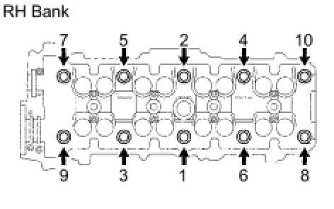 Install and uniformly tighten the 10 cylinder head bolts on one side of the cylinder head in several passes in the sequence shown.