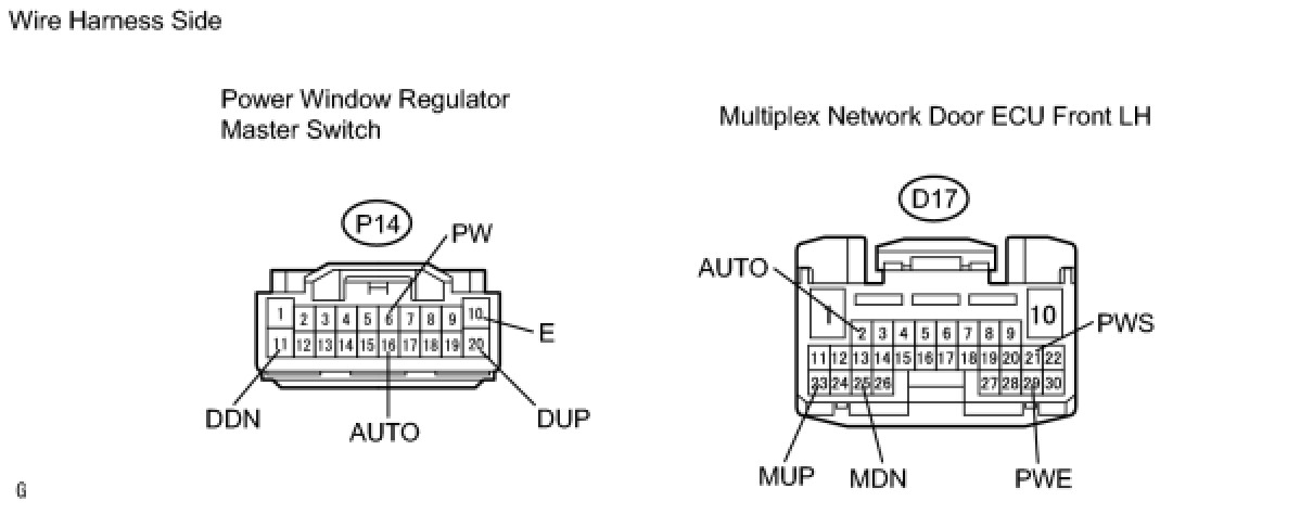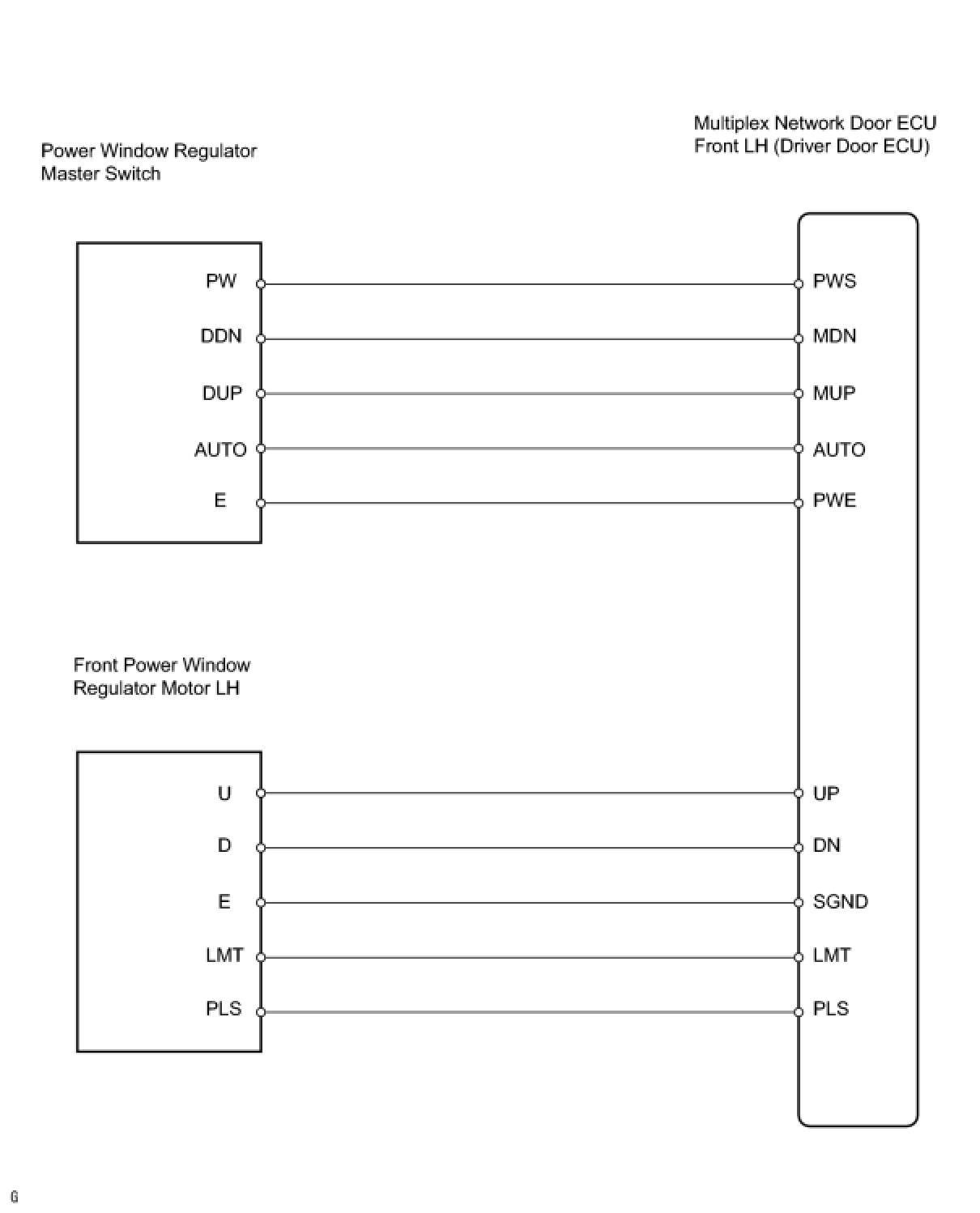 The power window regulator master switch sends signals to the multiplex network door ECU front LH (driver door ECU). The ECU then activates the appropriate power window regulator motor.