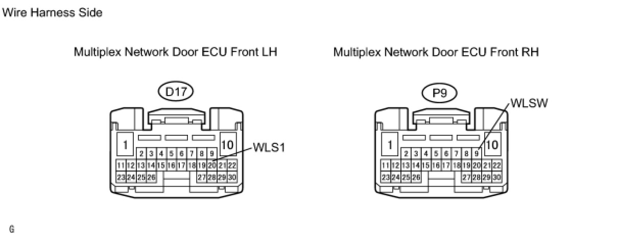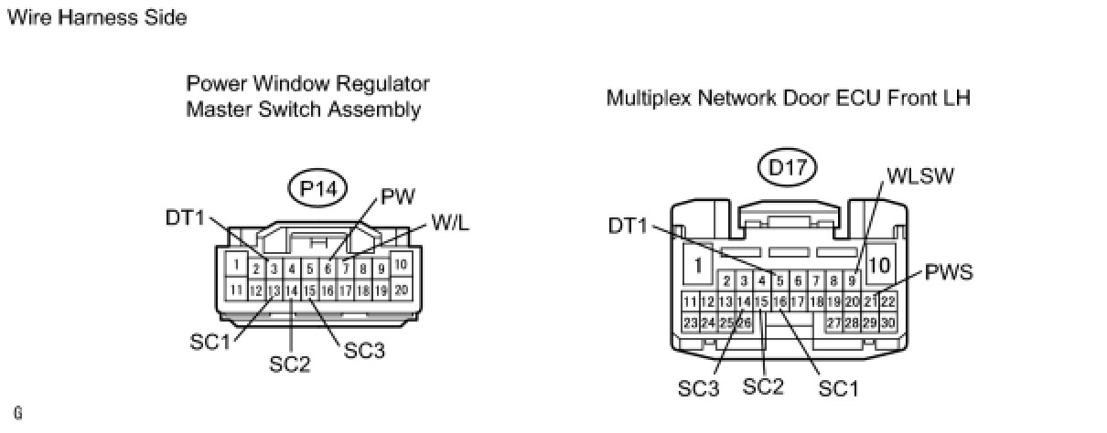 When the ignition switch is ON and the window lock switch is set to UNLOCK, the power window regulator master switch sends remote signals to the multiplex network door ECU front LH (driver door ECU), and the remote signals are then passed to the multiplex network door ECU front RH (passenger door ECU). The multiplex network door ECU front RH then activates the appropriate power window regulator motor.