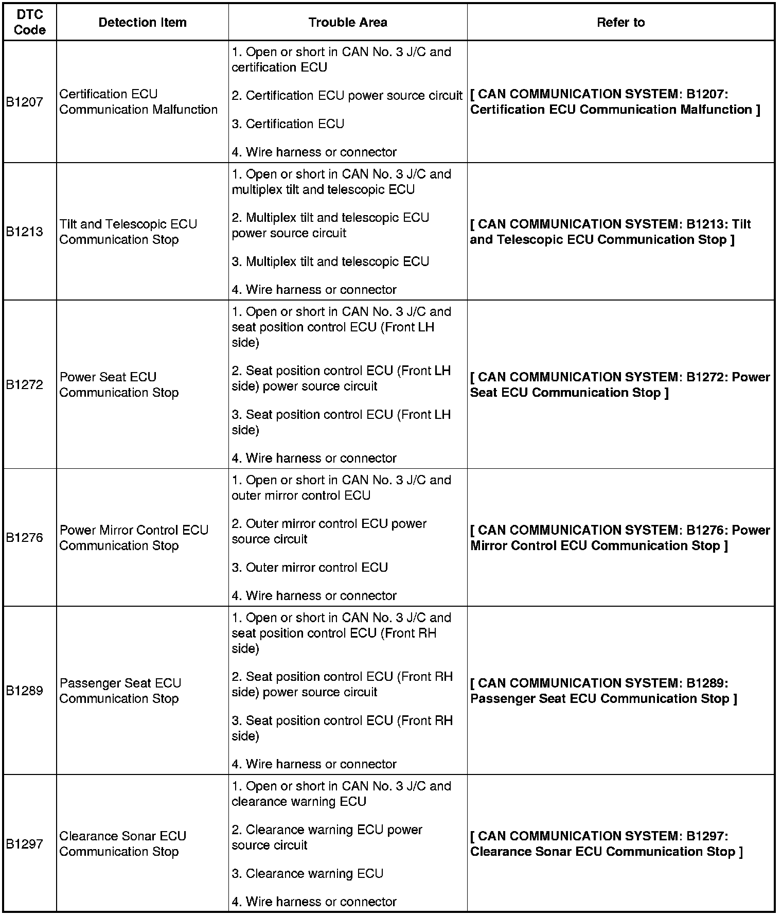 Only when the DTCs below are output from the gateway ECU, proceed to the pages listed in the "See page" column. If the DTCs are output from the ECUs other than the gateway ECU, refer to "HOW TO PROCEED WITH TROUBLESHOOTING" to determine the malfunctioning part.