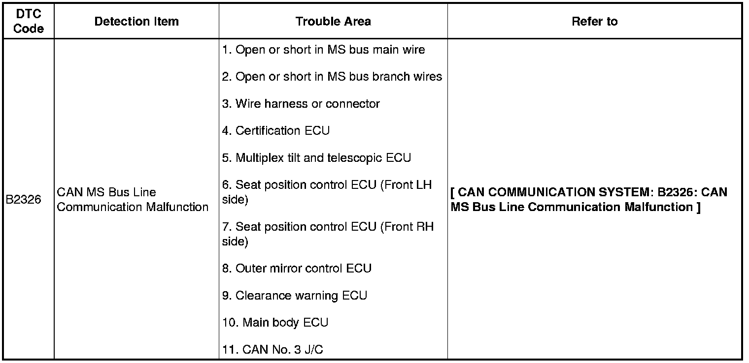 HINT: When communication with the ECUs connected to the CAN MS bus is interrupted or a malfunction in the CAN MS bus occurs, the main body ECU detects the malfunctions and outputs DTCs.