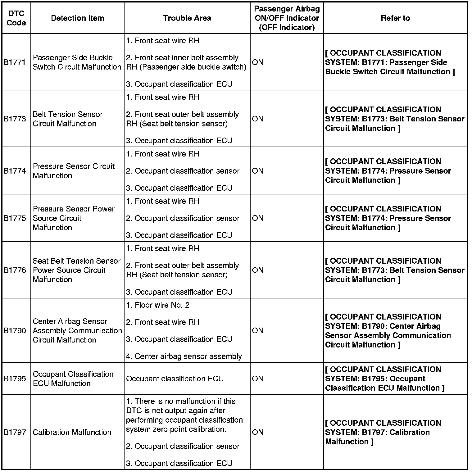 - When DTC B1650/32 is detected as a result of troubleshooting for the AIRBAG SYSTEM, perform troubleshooting for the OCCUPANT CLASSIFICATION SYSTEM as shown in the chart below.