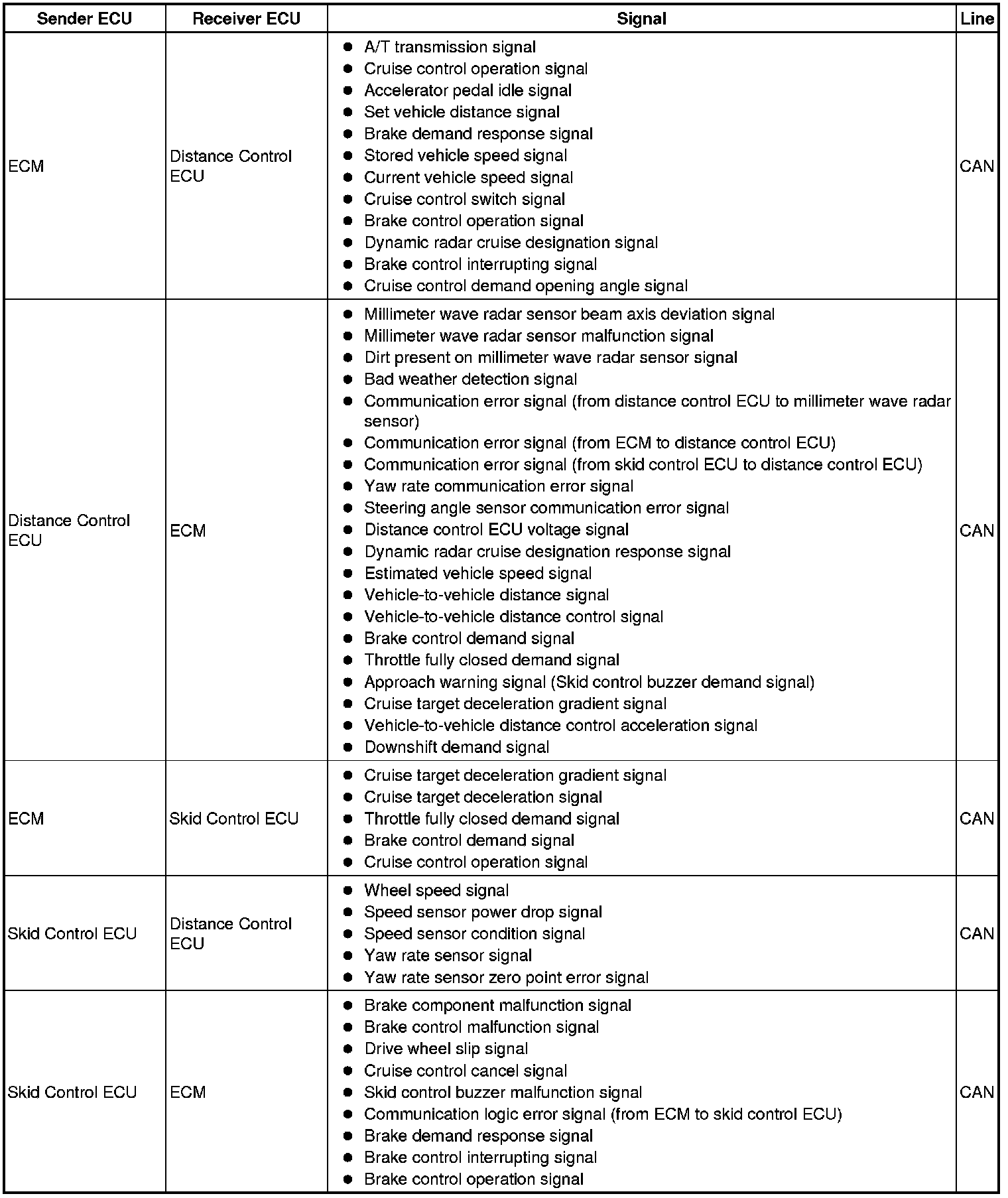 The distance control ECU determines the distance to the vehicle in front, relative speed, target decreasing speed, and deceleration rate. Based on these data, the ECU transmits a brake demand signal to the skid control ECU via the ECM.