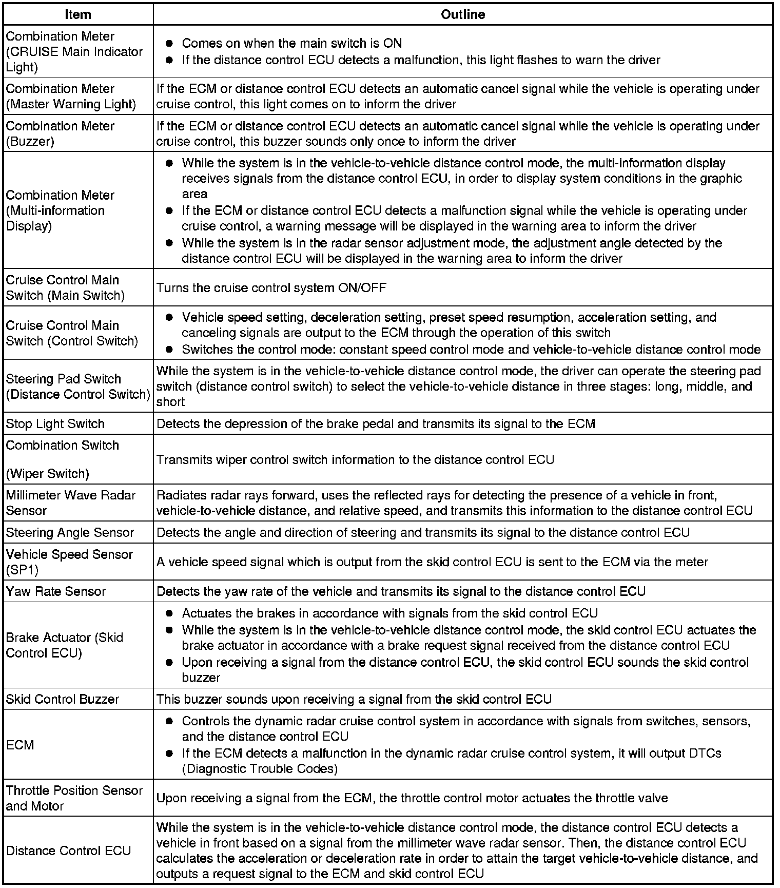 (d) The millimeter wave radar sensor and the distance control ECU control the system while the vehicle-to-vehicle distance control mode is in operation, and send signals to each actuator and ECU.