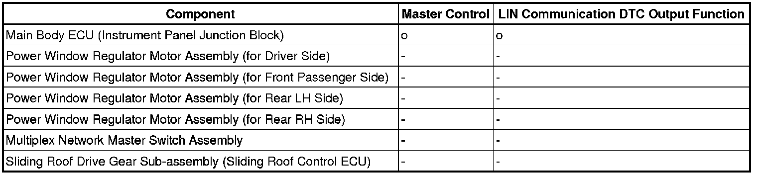 The LIN communication system is used for communication between the components in the table below. If communication cannot be performed through LIN communication because of an open in the communication lines or other reason, the master control ECU of the relevant system will output a DTC. Refer to the table below about the communication bus lines and connected components.