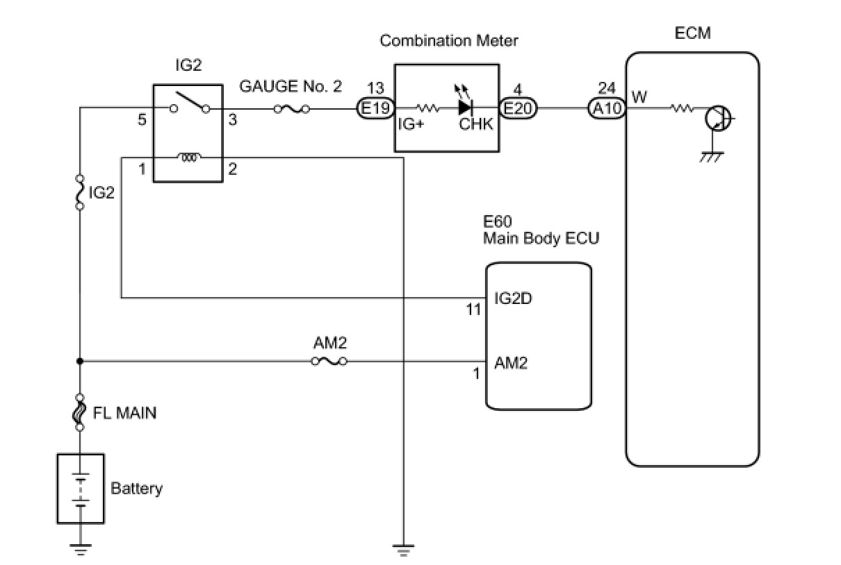 The MIL (Malfunction Indicator Lamp) is used to indicate vehicle malfunctions detected by the ECM. When the engine switch is turned on (IG), power is supplied to the MIL circuit, and the ECM provides the circuit ground which illuminates the MIL.