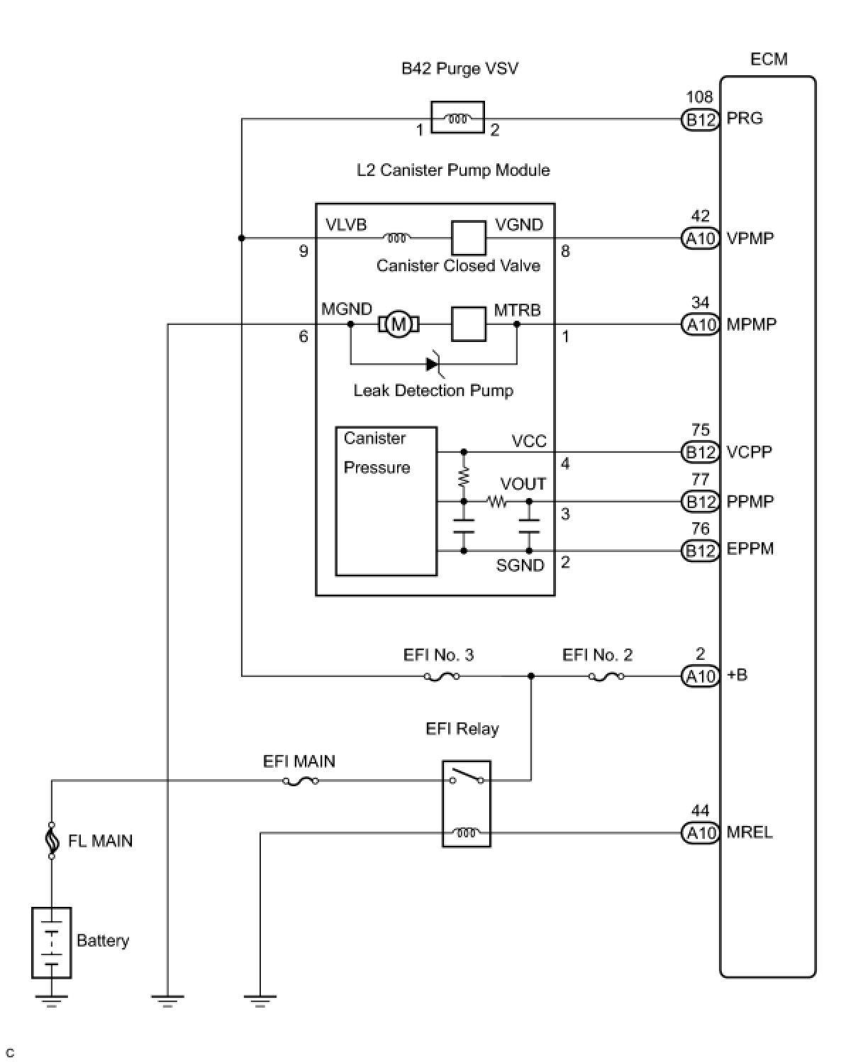 The leak detection pump creates negative pressure (vacuum) in the EVAP system and the pressure is measured. Finally, the ECM monitors for leaks from the EVAP system, and malfunctions in both the canister pump module and purge VSV, based on the EVAP pressure.